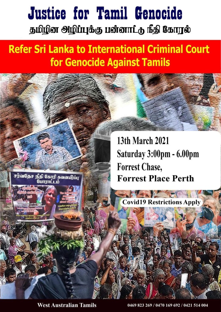 எமது தாயகத்தில் தமிழ் மக்கள் மீது நிகழ்த்தப்பட்ட இனவழிப்புக்கு நீதி கோரியும், தொடரும் கட்டமைக்கப்பட்ட இனவழிப்பை தடுத்து நிறுத்தக்கோரியும், தமிழின உரிமைகளை வலியுறுத்தியும் அமைதிவழி கண்டன பேரணி ஒன்றை ஏற்பாடு செய்யப்பட்டுள்ளது , மனித உரிமைகள் விடயத்தில் மீது பற்றுக்கொண்ட அனைவரையும் இதில் கலந்துகொள்ளுமாறு அன்புரிமையுடன் வேண்டி நிற்கின்றோம்.