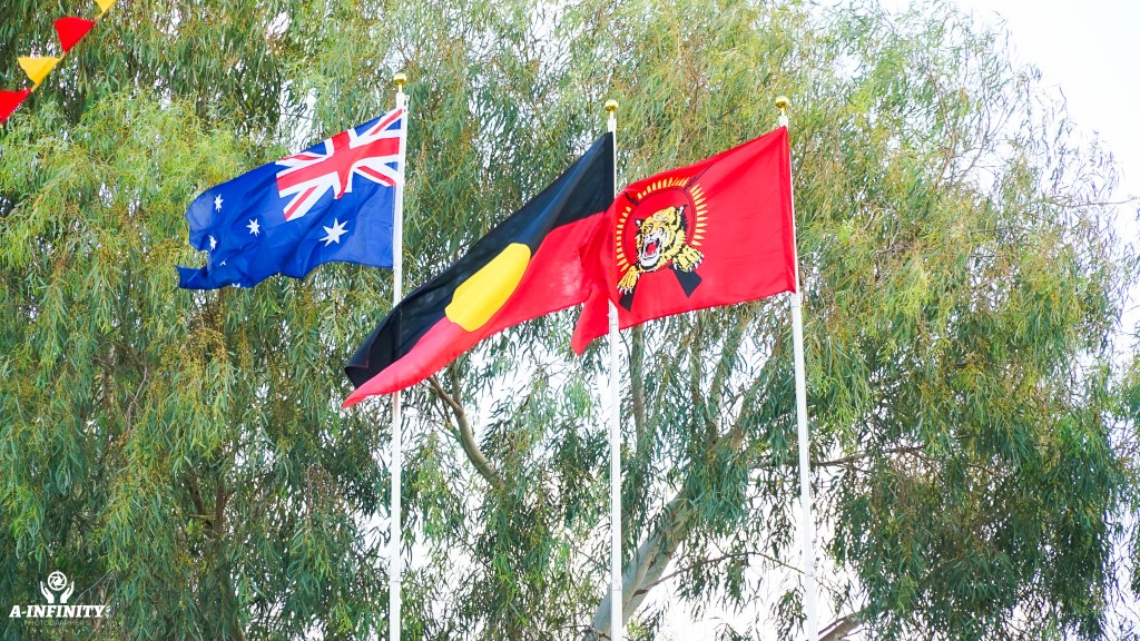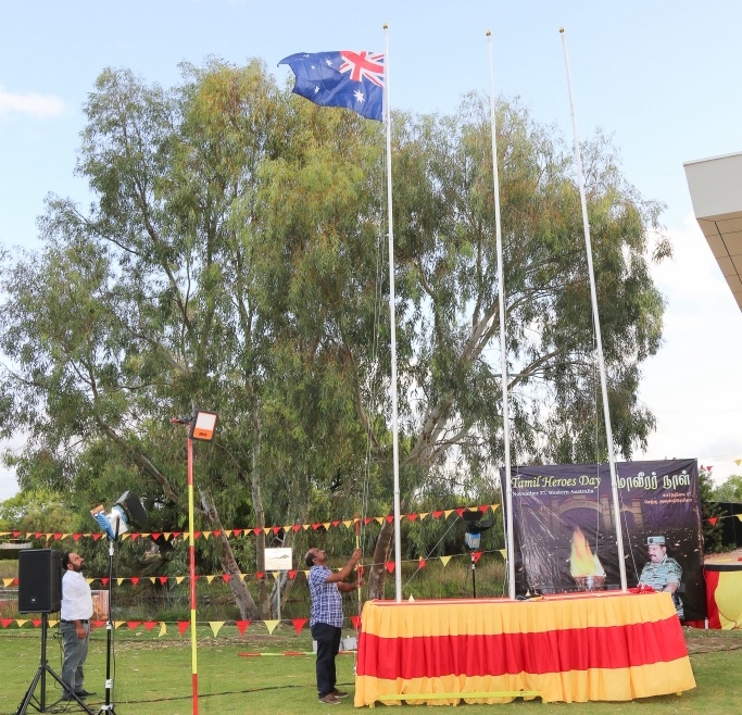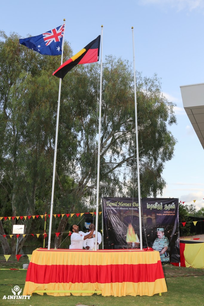 நிகழ்வுகளில் முதலாவதாக தேசியக்கொடிகள் ஏற்றப்பட்டன. அவுஸ்ரேலிய தேசியக் கொடியினை திரு. உமாகாந்தன் செல்வநாயகம் அவர்கள் ஏற்றிவைக்க, தொடர்ந்து அவுஸ்திரேலிய பூர்விக மக்களின் கொடியை திரு நிமலகரன் சின்னக்கிளி அவர்கள் ஏற்றிவைத்தார். தொடர்ந்து தமிழீழத் தேசியக் கொடியினை கேணல் சால்ஸ் அவர்களின் துணைவியார் திருமதி. ராஜி சாள்ஸ் அவர்கள் ஏற்றிவைத்தார்.