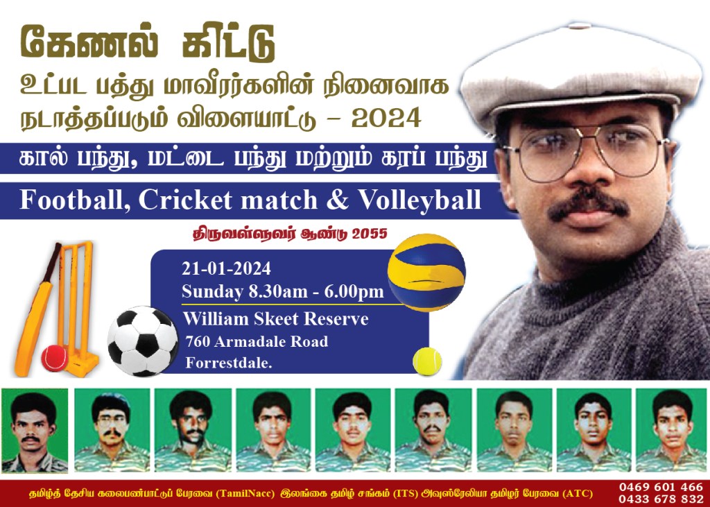 தாயகம் நேக்கிய பயணத்தின் போது 16.01.1993 அன்று வங்கக் கடற்பரப்பில் வைத்து இந்திய சதிவலைக்குள் சிக்காமல் தாம் பயணித்த படகுடன் தம்மை தீ மூட்டி வீரச்சாவை தழுவிய கேணல் கிட்டு உள்ளிட்ட பத்து மாவீரர்களின் முப்பத்தி ஒராவது ஆண்டு நிறைவு நாள் 16.01.2024 ஆகும். தமிழ்த் தேசிய கலை பண்பாட்டுப் பேரவை மற்றும் அவுஸ்ரேலிய தமிழர் பேரவையும் இணைந்து ஆண்டு தோறும் வங்கக்கடல் வேங்கைகளின் நினைவாக மேற்கு அவுஸ்ரேலியாவில் நடாத்தப்படும் விளையாட்டு 21.01.2024 ஞாயிற்றுக்கிழமை இடம்பெற்றது.