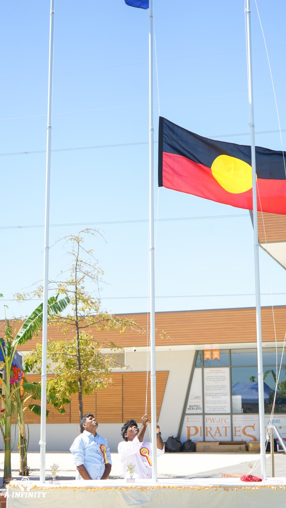 தொடர்ந்து தேசியக் கொடிகள் ஏற்றி வைக்கப்பட்டன. அவுஸ்ரேலிய தேசியக் கொடியினை, இலங்கை தமிழ்ச் சங்கம் சார்பாக திரு.ஐீவன் ஜெகநாதன் அவர்கள் ஏற்றி வைக்க தொடர்ந்து அவுஸ்ரேலிய பூர்வகுடி மக்களின் கொடியினை தமிழ்த் தேசிய செயற்பாட்டாளர் திரு சபாநாதன் இளையதம்பி அவர்கள் ஏற்றி வைத்தார். அதனை தொடர்ந்து தமிழீழ தேசியக் கொடியினை தமிழ்த் தேசிய கலை பண்பாட்டுப் பேரவை உறுப்பினர் திரு கதிர் அவர்கள் ஏற்றி வைத்தார். தொடர்ந்து தமிழீழ மண்மீட்பு போரில் வீரச்சாவை தழுவிய மாவீரர்களுக்கும் மக்களுக்குமாக அகவணக்கம் செலுத்தப்பட்டது.