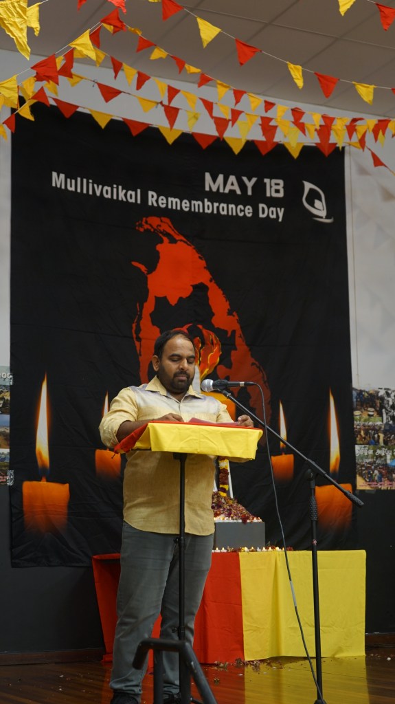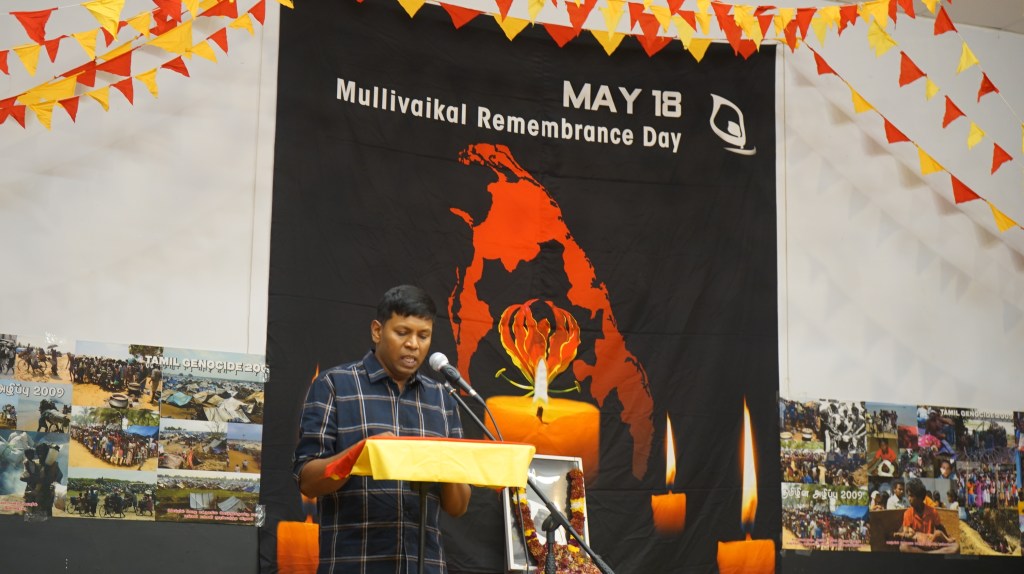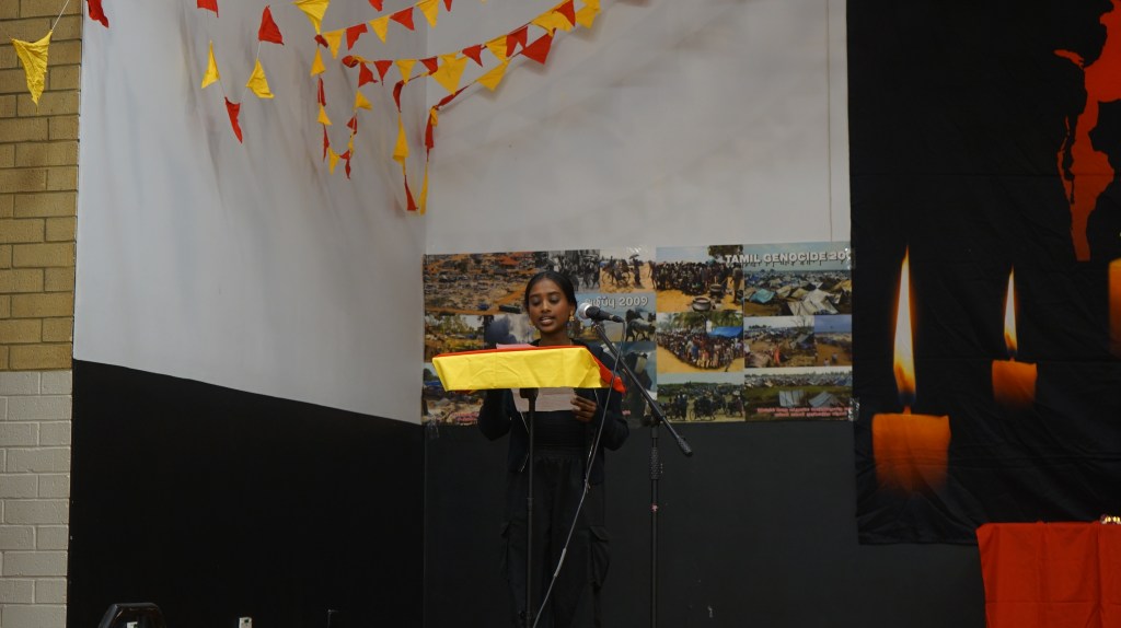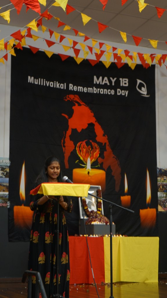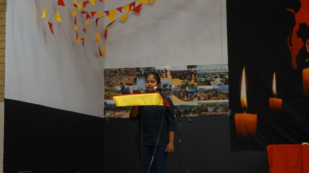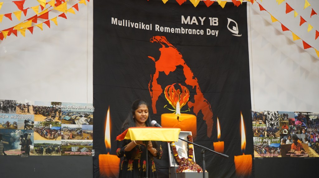 தொடர்ந்து “நாம் கடந்து வந்த நாளல்ல இன்றுவரை நாம் கடந்துவிட முடியாமல் கனத்துக் கிடக்கும் நாள்….. என்னும் கவிதை இடம் பெற்றது. இக்கவியை செல்வி யதுர்சிகா ரகுநாதன் வழங்கினார்.