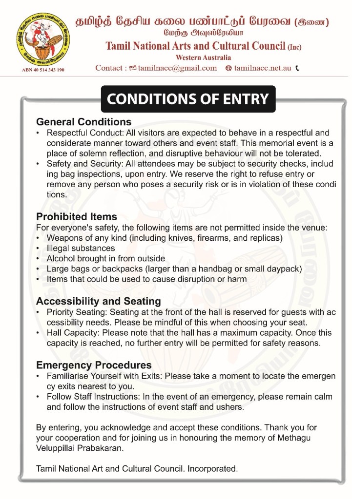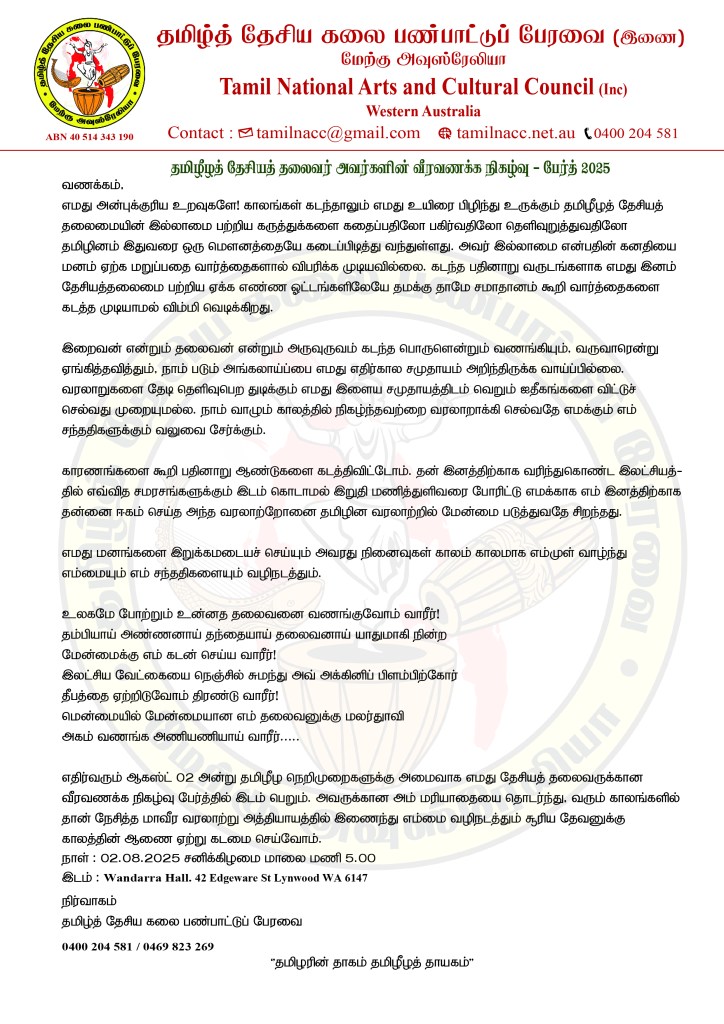 எதிர்வரும் ஆகஸ்ட் 02 அன்று தமிழீழ நெறிமுறைகளுக்கு அமைவாக எமது தேசியத் தலைவருக்கான வீரவணக்க நிகழ்வு பேர்த்தில் இடம் பெறும். அவருக்கான அம் மரியாதையை தொடர்ந்து, வரும் காலங்களில் தான் நேசித்த மாவீர வரலாற்று அத்தியாயத்தில் இணைந்து எம்மை வழிநடத்தும் சூரிய தேவனுக்கு