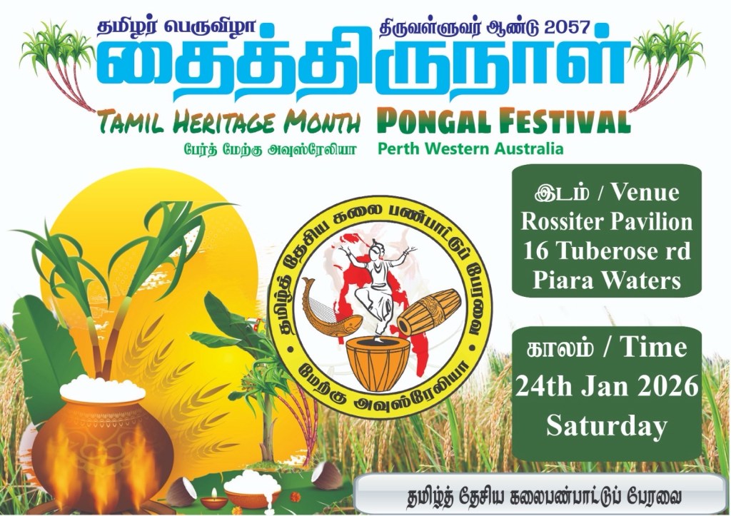 தமிழ்த் தேசிய கலைபண்பாட்டுப் பேரவையினால் வருடந்தோறும் மேற்கு அவுஸ்ரேலியாவில் நடாத்தப்படும் தைத்திருநாள் வழமையான இடத்தில் 24.01.2026 சனிக்கிழமை நடைபெறும் என்பதை மகிழ்வுடன் அறியத்தருகின்றோம்.
